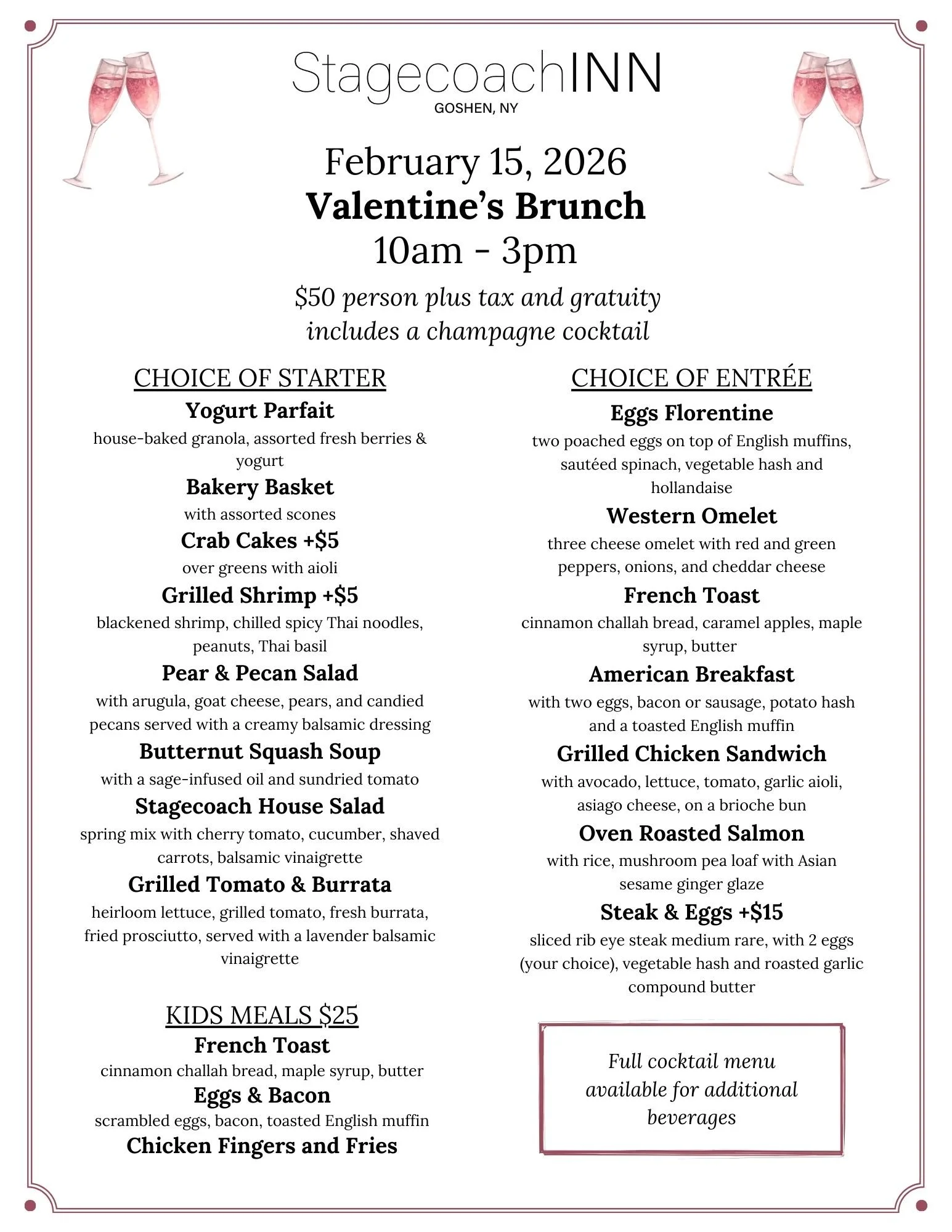 Valentine’s Brunch at the STAGECOACH INN 💕 Saturday, February 15 | 10:00 AM – 3:00 PM | Prix Fixe