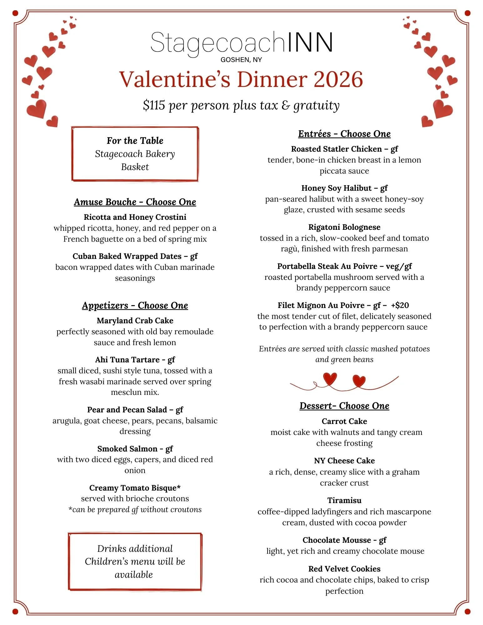 Valentine’s Weekend Dinner Celebrate love at STAGECOACH INN with a romantic Valentine’s Weekend Prix Fixe Dinner, available Friday and Saturday, 2/13 & 2/14, from 4–9 pm. Enjoy an intimate evening of thoughtfully curated courses in the cozy, candlelit charm of the inn—perfect for date night or a special night out with someone you love.