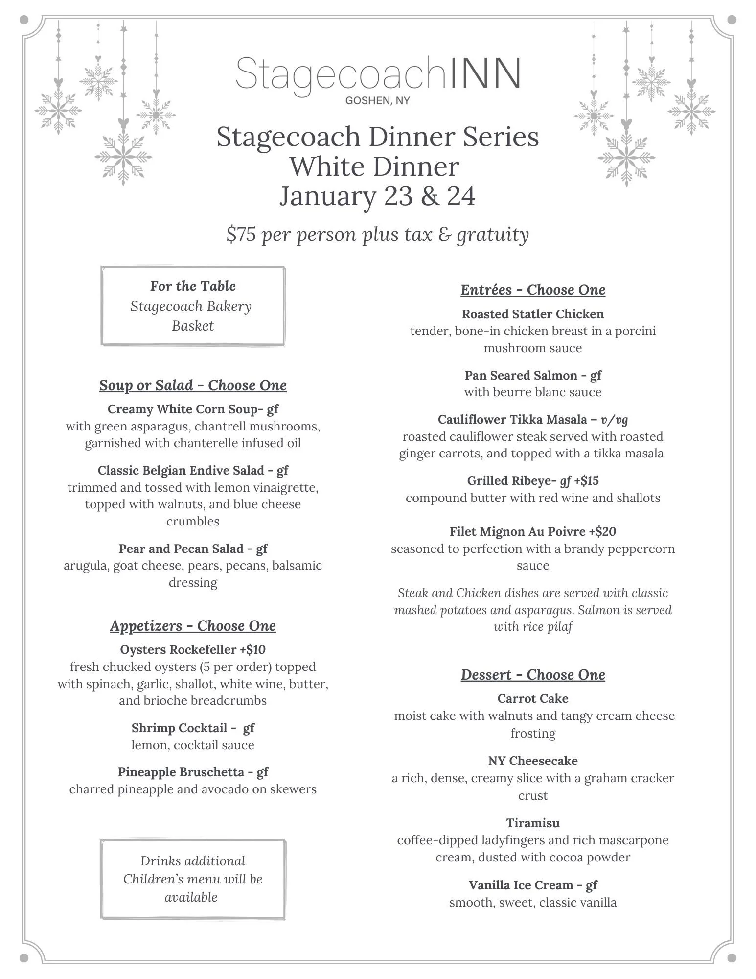 Step into a winter wonderland at the Stagecoach Inn. For two enchanting evenings, our Dinner Series transforms the inn into a shimmering landscape of white and crystal—embracing the magic of freshly fallen snow. Guests are encouraged to dress in white and join us for a chic, spirited night out celebrating the beauty of the season.