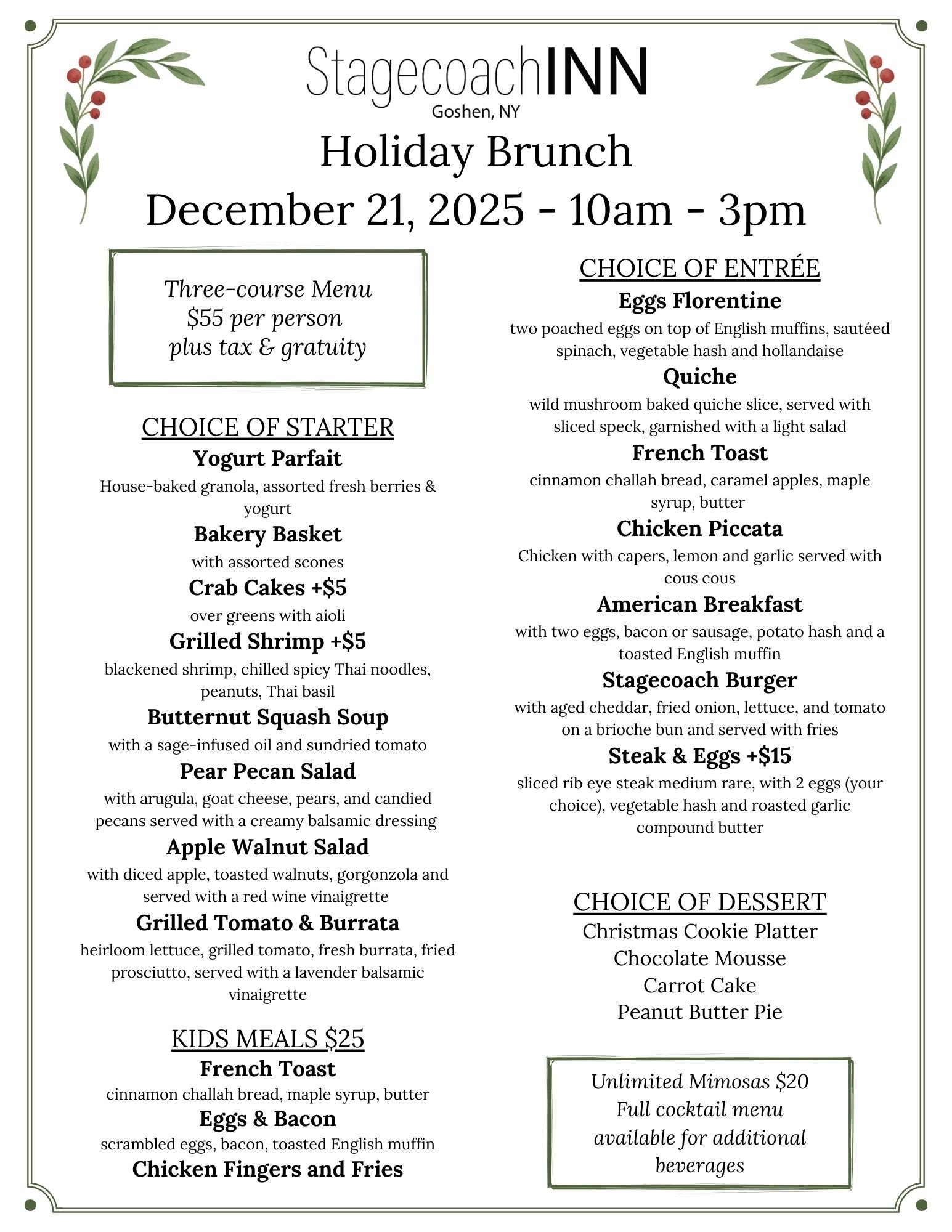 Celebrate the season with our Holiday Brunch—a thoughtfully crafted $55 prix fixe menu served in the warm glow of the Inn. Enjoy beautiful dishes, great company, and unlimited mimosas for $20. Menu posted below.