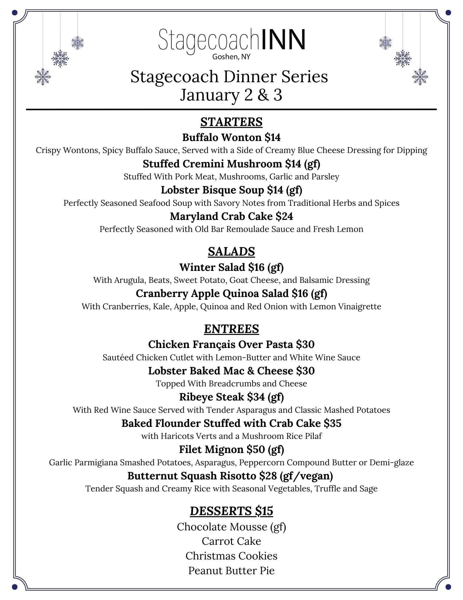 Join us for an intimate, curated evening on Friday, January 2 and Saturday, January 3. Delight in seasonally inspired dishes crafted from the Hudson Valley’s finest local ingredients, paired with bold flavors and the warm hospitality you’ve come to expect at the Stagecoach Inn.